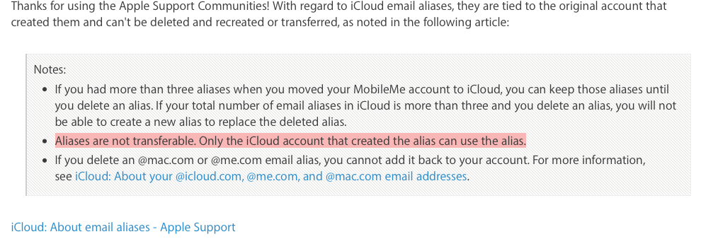 Hello all! Quick question... I have two iCloud accounts. One for personal use, one for business use. I currently have an alias (example: alias@icloud.com) attached to my personal account that I would like to move to my business account. It's an iCloud address (not a @me.com or @mac.com). Is this possible... and if so... how? Can I delete the alias from my personal account and then simply create it in my business account?