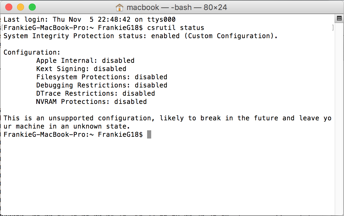 5. Type csrutil status in OSX Terminal and verify that is it disabled. If still enabled, repeat.
