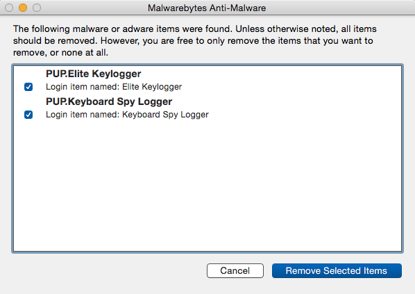 You specifically asked about Login Items in MalwareBytes. You should definitely use MalwareBytes to remove these items. What some people don't understand is that the list of "Login Items" in System Preferences is not a complete list. Any application can install its own login items using another method and they will not be listed in System Preferences. That is why you do not see those key loggers that MalwareBytes is reporting. It is because Apple doesn't show them to you. I recently added support in EtreCheck to report these new kinds of login items as well as other kinds of hidden tasks that are running the background. But unfortunately, I just don't have the resources to keep track of all the Mac adware and malware. It is reaching epidemic proportions. Sadly, and for reasons I do not understand, some people are doing everything in their power to make it worse.