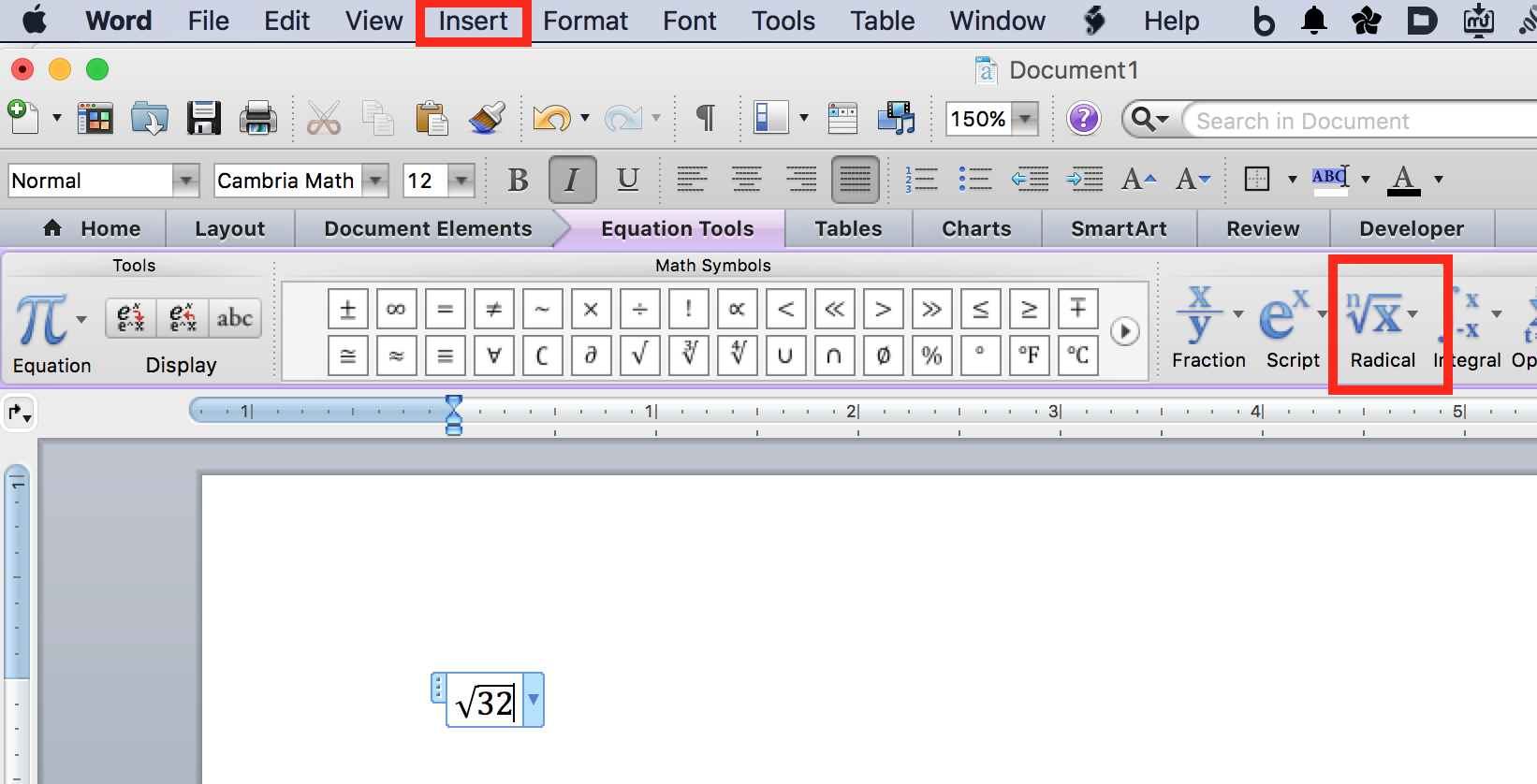 Hello all. I have been doing the square root symbol (√) by typing alt/option + v to make the square root.