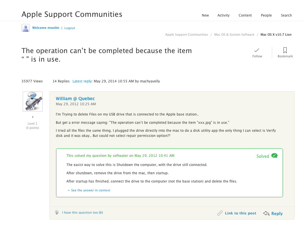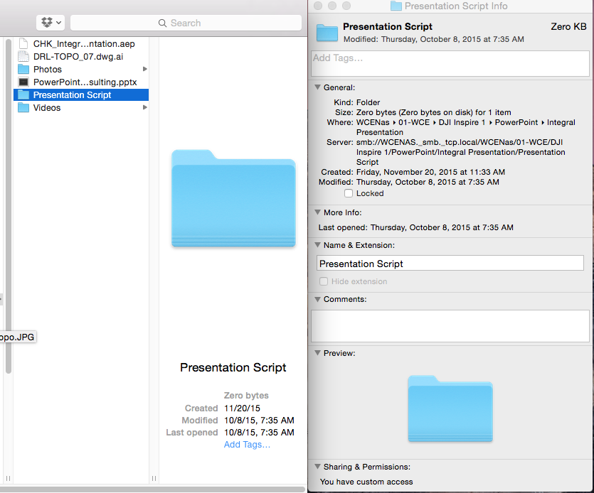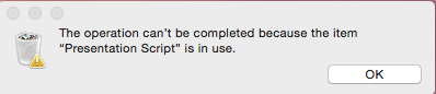 Occasionally, after creating a new folder in Finder, it won't let me copy to, or delete the folder. When I try and delete the folder I receive a message that says, "The operation can't be completed because the item "Presentation Script" is in use. Presentation Script is of course the name of the folder.