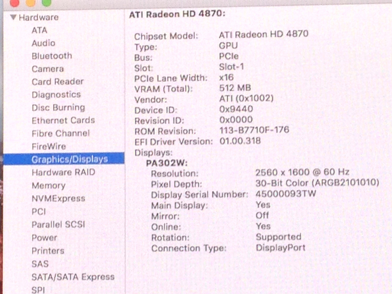 I recently purchased a used ATI Radeon HD 4870 graphics card ( Apple model # - MB999ZM/A) to install in my early-2008 Mac Pro. This card was originally offered by Apple as an upgrade for earlier Mac Pros. The card has a mini display port (and a DVI-D port). I am running El Capitan on my Mac Pro. I have a 10-bit color capable NEC PA 302W monitor. Can anyone tell me if the ATI HD 4870 card will support 10-bit color to my monitor? I was encouraged to learn from the forum that the drivers (and hopefully their updates) for supported graphics cards are automatically included in the Mac operating systems. I'd appreciate any help anyone can give me. The card is scheduled to be delivered next week. Thanks a lot, Jack