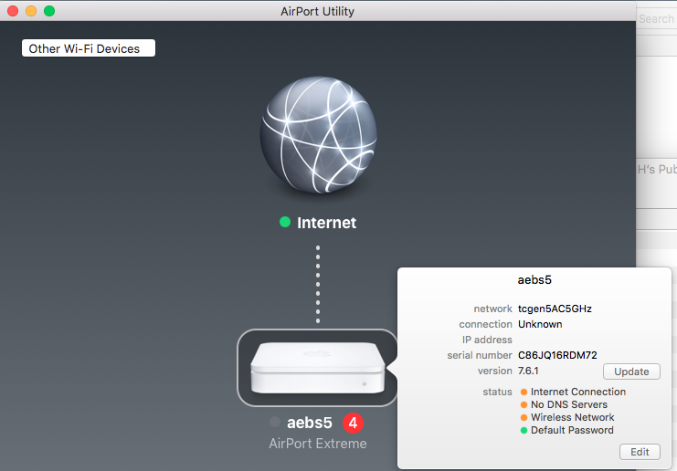 I use an airport extreme as my primary router, with two airport express units as repeaters (or extenders). One airport express is single band only, so it should be disregarded for any diagnostic questions related to my question.
