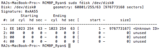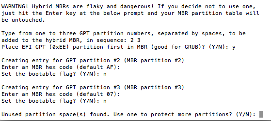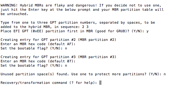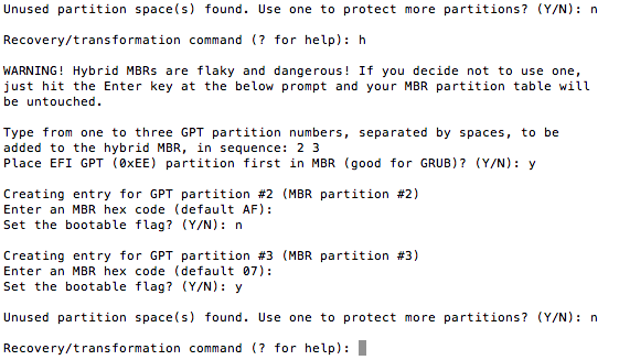 Rebuild MBR to match the new GPT information thus resetting the Hybrid MBR. Use defaults for other questions (like partition codes). The only values that need modifications are the Boot flags and step 10. Accept all other defaults that Gdisk offers. Please see thesample Q&A as an example. These steps can be repeated if you make a mistake before you get to Step 12, otherwise start from Step 1 for these steps. Step 6 has numbers which are typed with a space between the numbers. Please see the sample Q&A before you execute these steps.