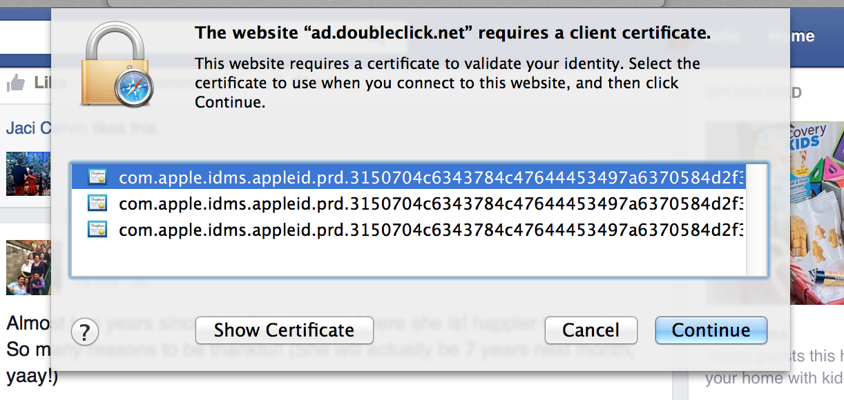 The website "ad.doubleclick.net" requires a client certificate when I open Safari. What does this mean? It gives me 3 certificates to choose from.