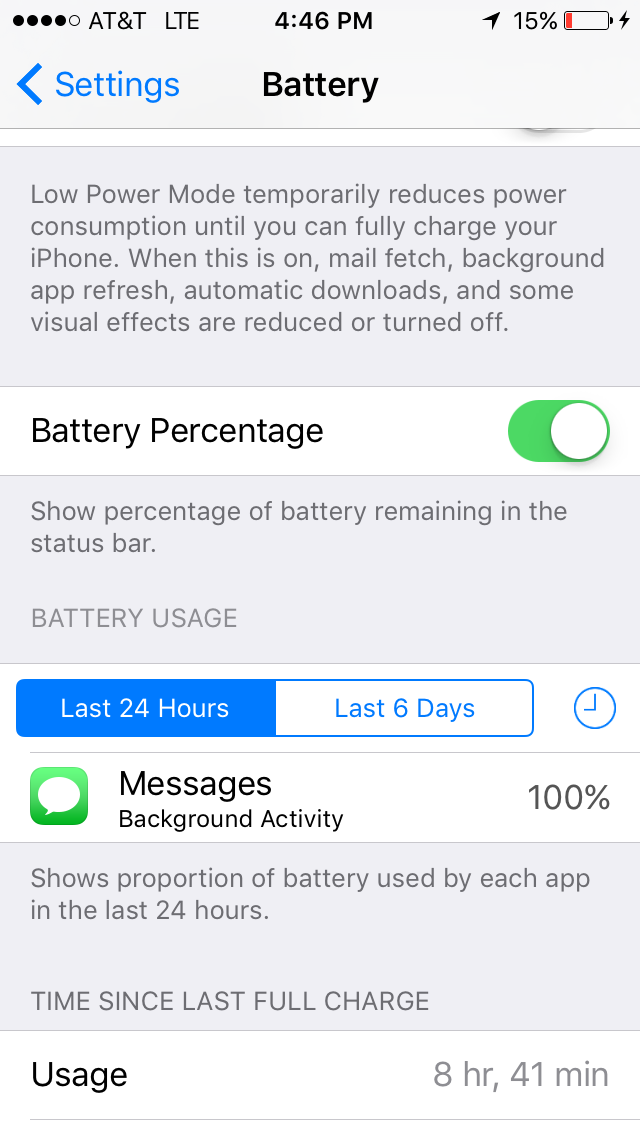 Before the battery drained. I had not used my phone -AT ALL-- since the last full charge. note 100% of battery usage is attributed to messages background activity