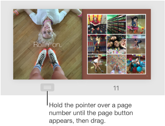 in the toolbar, choose Remove Page, then click Continue. You can also Control-click the page, choose Remove Page, then click Continue. - Move a page in a book: Position the pointer over a page number until the page button appears, then drag the page button to move the page to a new location. You can also select a page and then drag the page button.