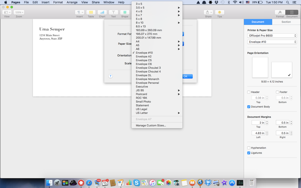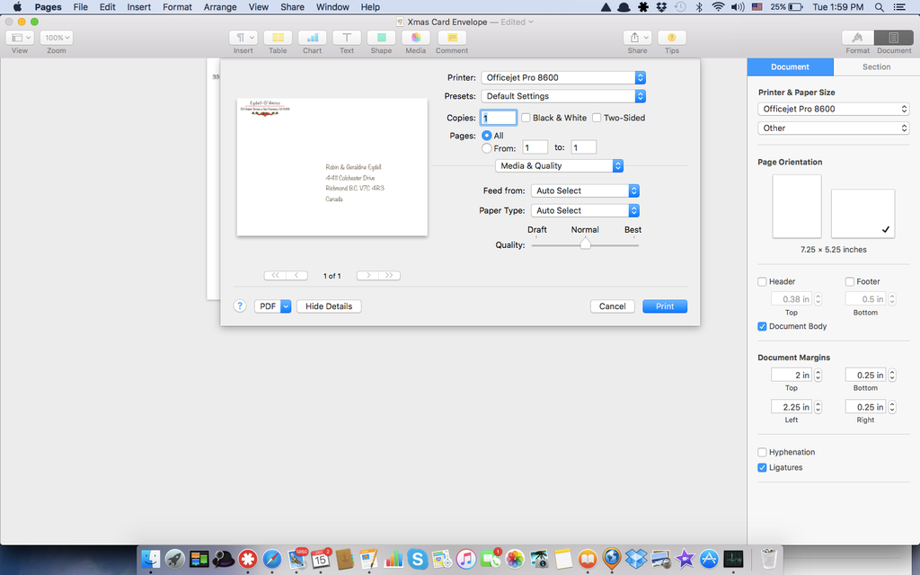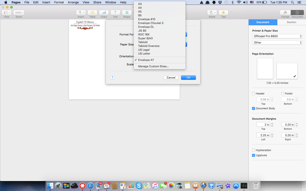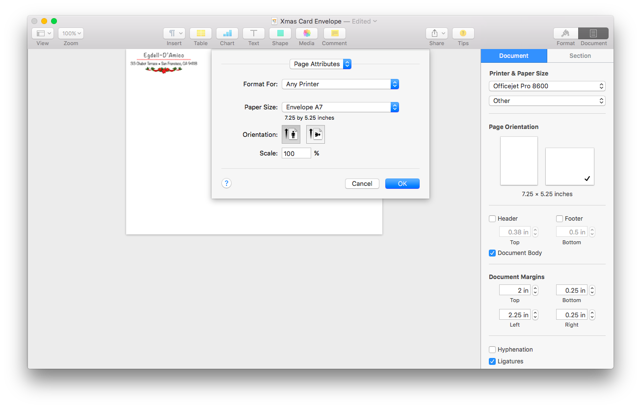 When I format the envelope using this “custom” paper size it looks gorgeous. However, when I try to print it with an A7 envelope loaded into the paper tray, the printer balks with a message saying that the wrong paper size has been detected. When I load standard letter size paper in the tray it goes ahead and prints, but with the 7.25” x 5.25” document justified down in the bottom right-hand corner of the page.