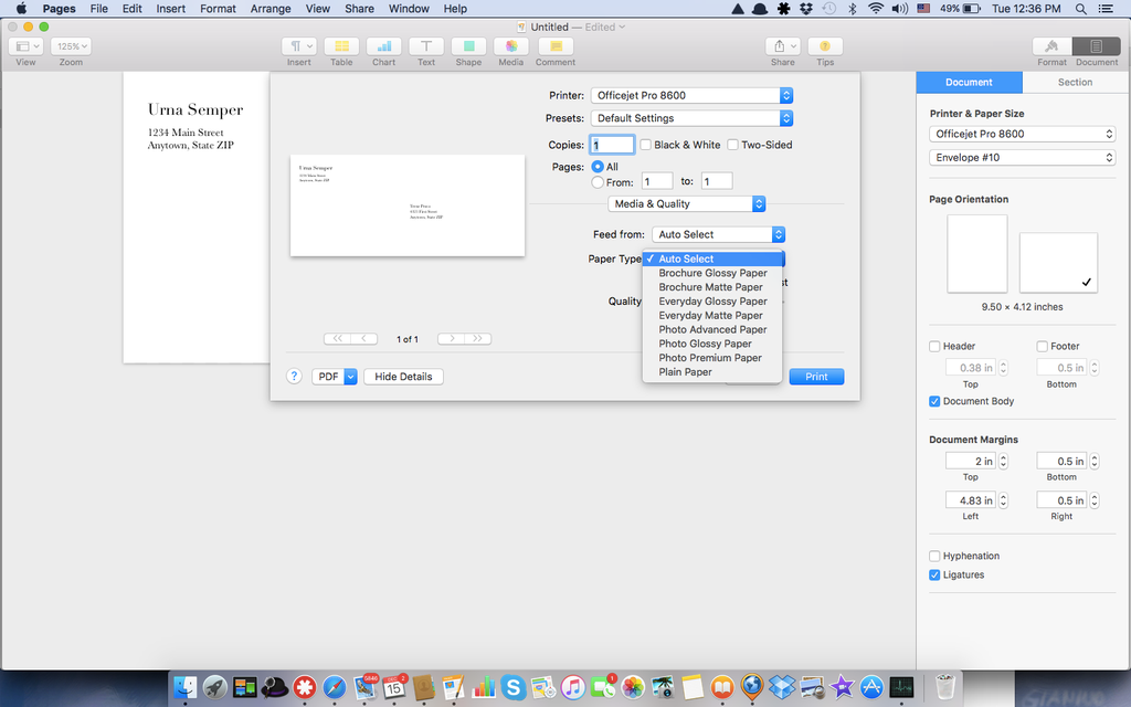 I am using Pages (Version 5.6.1) on a MacBook Air (mid 2012) running OS X El Capitan (Version 10.11.1) to try to print size A7 envelopes (7.25” x 5.25”) on an HP Officejet Pro 8600 Plus e-All-in-One Printer - N911g. The printer’s paper tray has movable guides that adjust to hold envelopes so that they feed into the printer lengthwise from the centre of the tray.