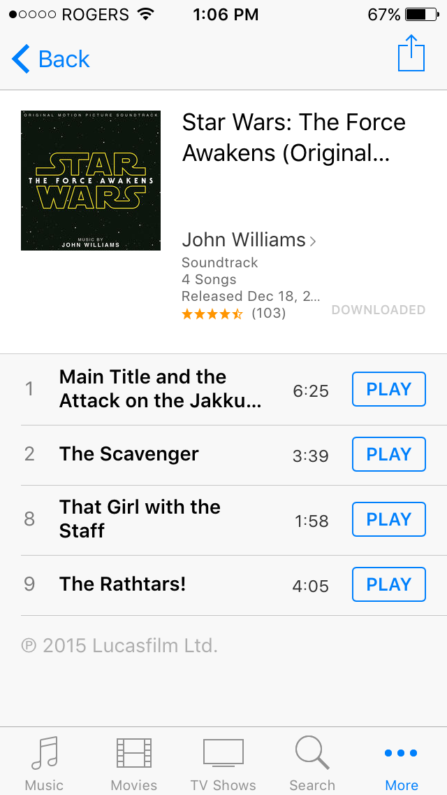 My sister has been trying to download the Star Wars: The Force Awakens album from my purchases (under the family sharing stuff: Purchases/<my name>/John Williams (SW: TFA artist)), but she only sees 4 tracks out of 23 tracks.* (I have also purchased the complete album for The Force Awakens.) I haven't tried syncing her iPhone on her PC, but I'm assuming, based on my experience, I will encounter the same problem as with my iPhone.