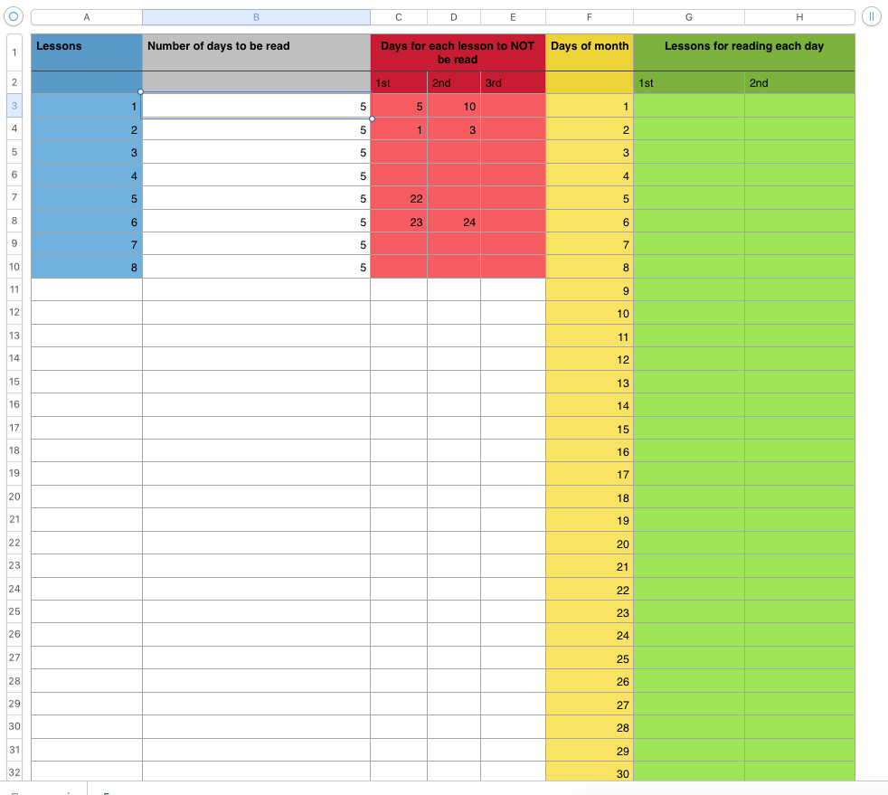 Pairs: This table contains a list of the 28 distinct pairs possible when randomly pulling two numbers from a set of eight, plus two repeated pairs to make up the 30 needed for the reading list. Because all pairs are used, each lesson will be scheduled for reading seven times over the 30 days, and the four lessons chosen for the extra pairs will be scheduled for reading 8 times. There's no need for the Count Table (as it will always be the same when all red cells are removed from the Choices table), nor is there a need to specify a minimum number (5) of scheduled readings.