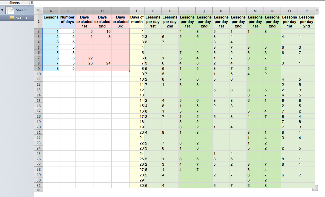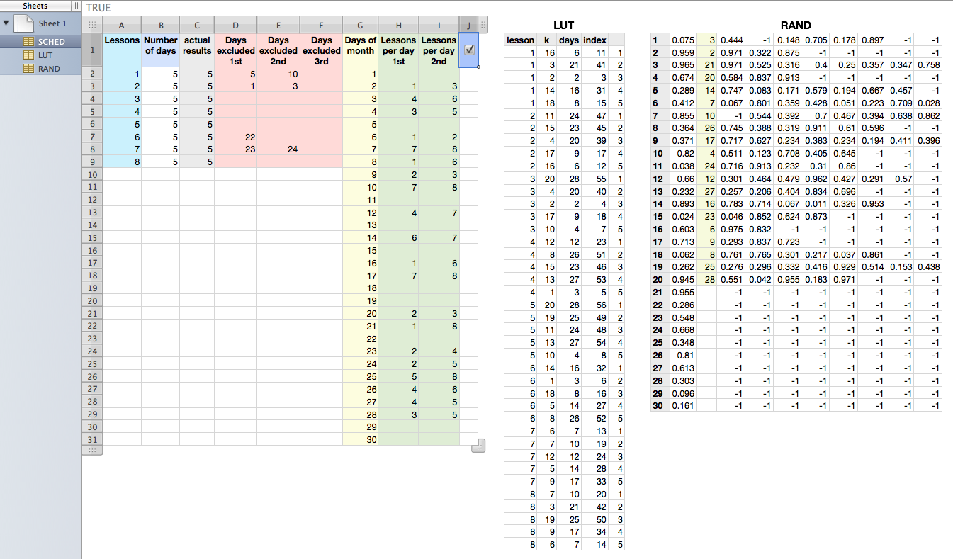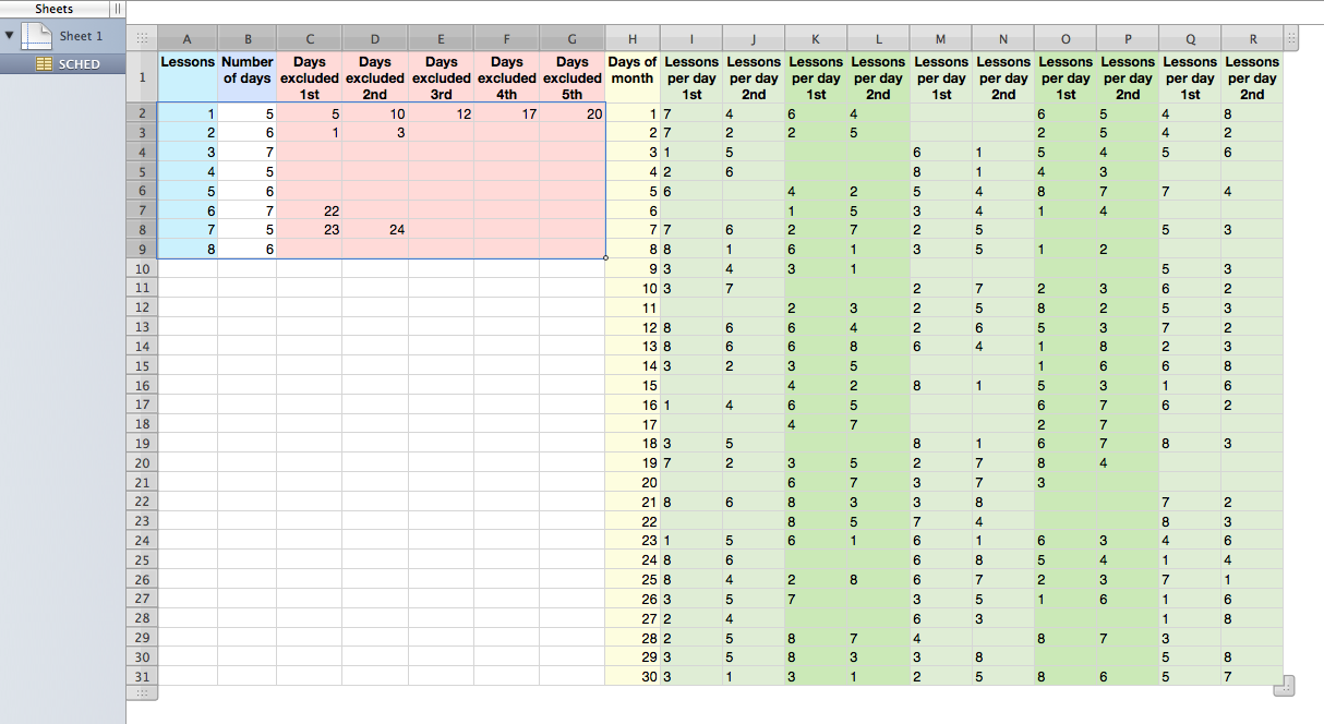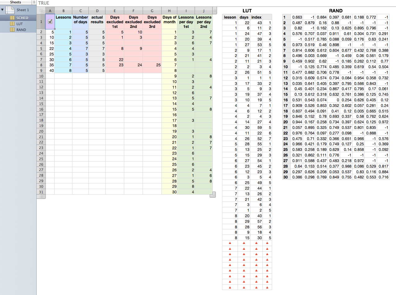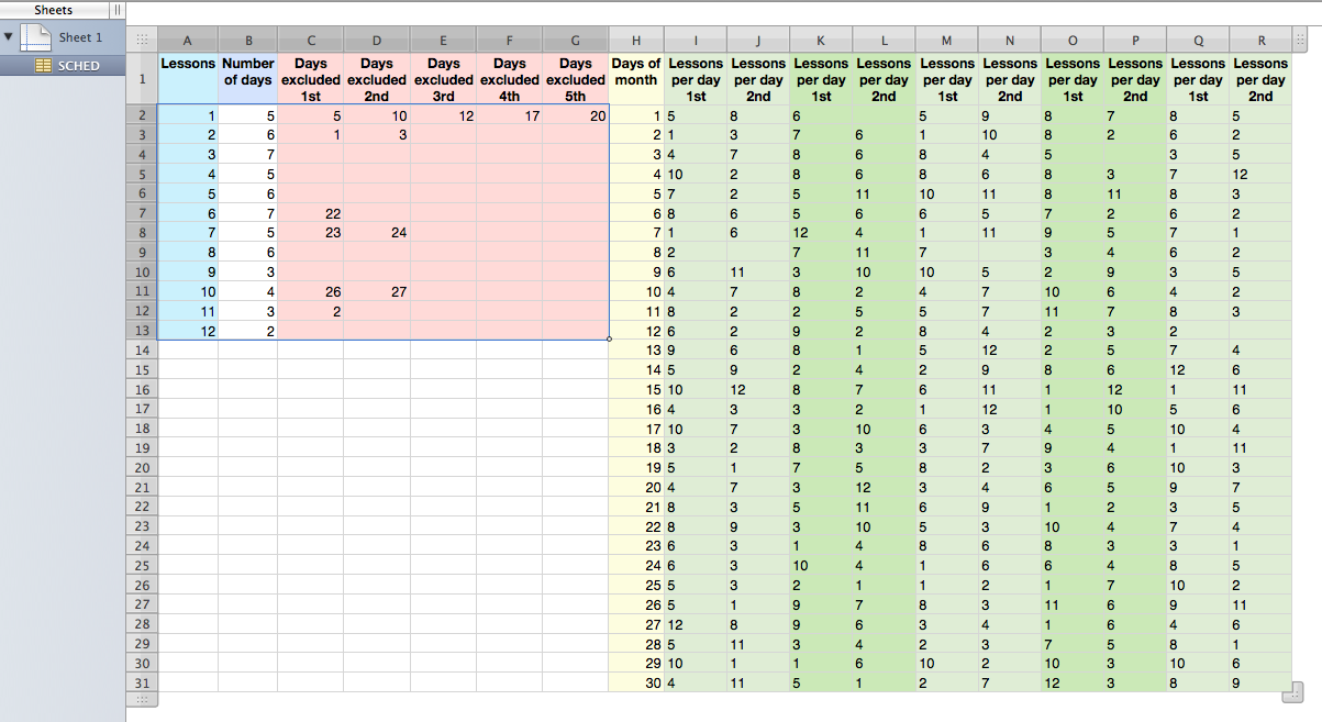 SCHED (excerpt) A1 TRUE A2 =SUM(C$2:C2) A3 =SUM(C$2:C3) B1 Lessons B2 1 B3 2 C1 Number of days C2 5 C3 5 D1 actual results D2 =COUNTIF(I$2:J$31,B2) D3 =COUNTIF(I$2:J$31,B3) E1 Days excluded 1st E2 5 E3 1 F1 Days excluded 2nd F2 10 F3 3 G1 Days excluded 3rd G2 G3 H1 Days of month H2 1 H3 2 I1 Lessons per day 1st I2 =IFERROR(INDEX(LUT::A,MATCH($H2*2-1,LUT::C,0)),"") I3 =IFERROR(INDEX(LUT::A,MATCH($H3*2-1,LUT::C,0)),"") J1 Lessons per day 2nd J2 =IFERROR(INDEX(LUT::A,MATCH($H2*2,LUT::C,0)),"") J3 =IFERROR(INDEX(LUT::A,MATCH($H3*2,LUT::C,0)),"")