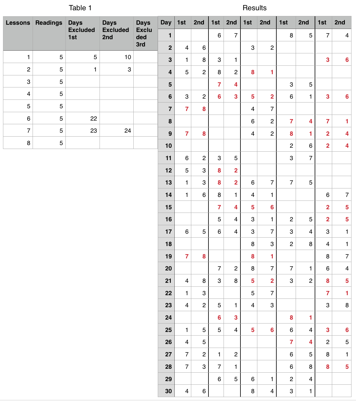 Recalculate: Clicking the checkbox forces a recalculation of the tables. Use it when you want a re-ordered reading list or when your first selection results in red cells due to lesson numbers being assigned to days when they are not to be read.