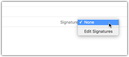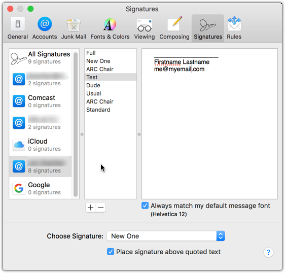 Lastly, even though now I have signatures available to the "problem" account, there is still one bug with it. Even if I set a default signature for it, it will NEVER show the default signature when I start a new email, I still have to manually choose it from the signature dropdown. All 5 of my other accounts correctly show the default signature I set in preferences when I start a new email. Small consolation I guess is that at least I can pick the signature from the dropdown menus now for the problem account.