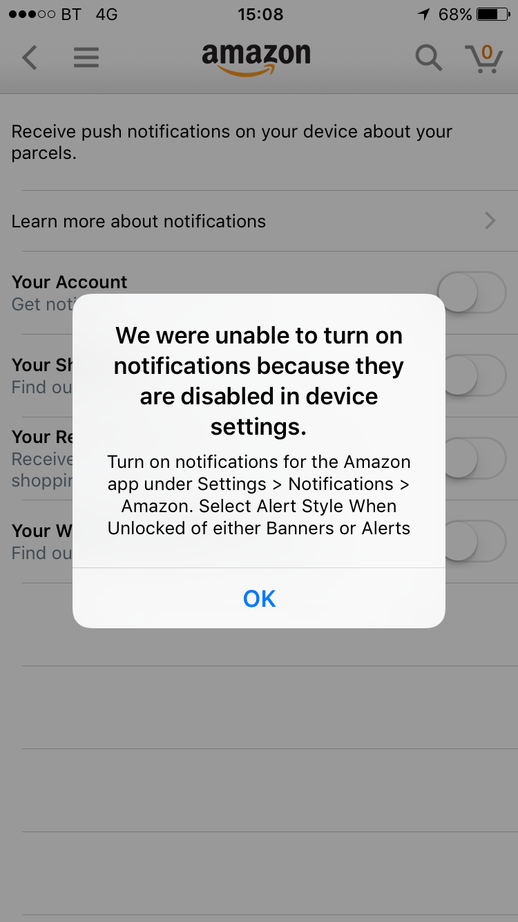 For anyone else still having this problem, in the Amazon app tap the menu icon (three lines) in the top left of the app, then tap Notifications. It will ask you to accept notifications. Accept that and it will turn on the notifications for you. If it does not ask you this, delete the app and reinstall and try again. Worked for me! 🙂