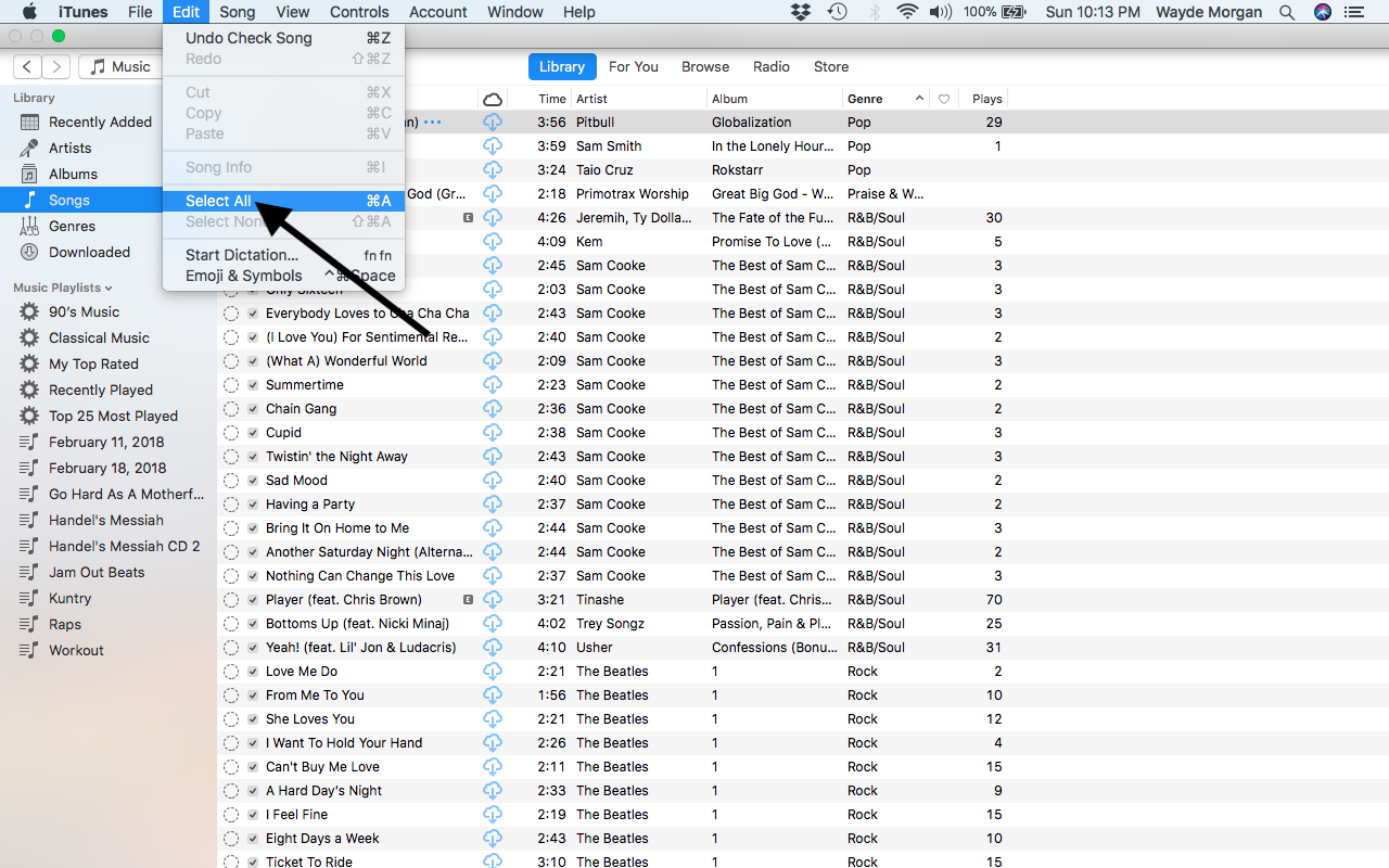Open iTunes, go to Library, then navigate to Songs. Once at songs, you will see all of your songs with the cloud-with-down-arrow next to them. First, simply select the first song. Then you will want to move your cursor to Edit.