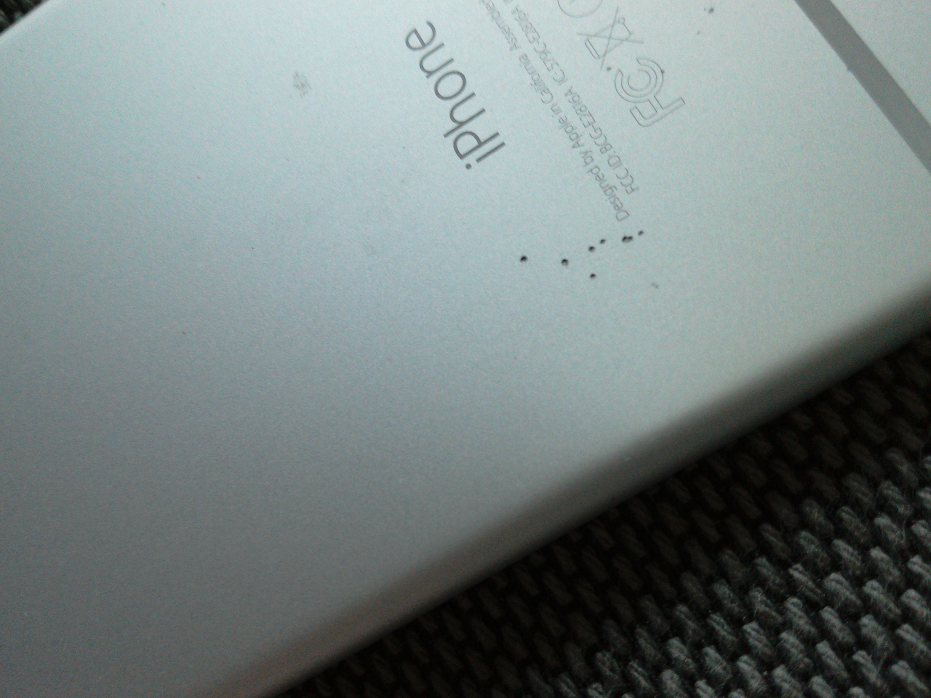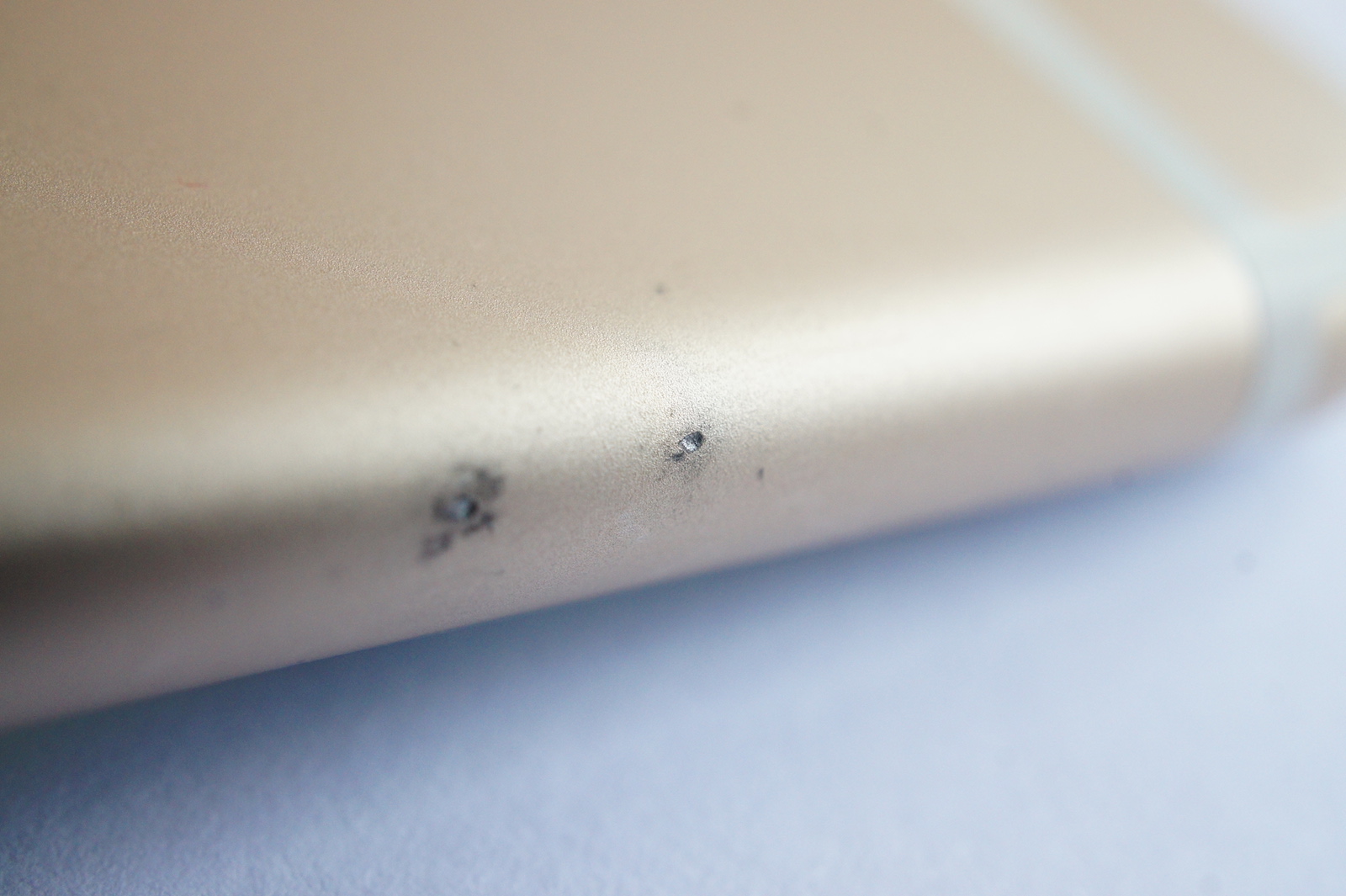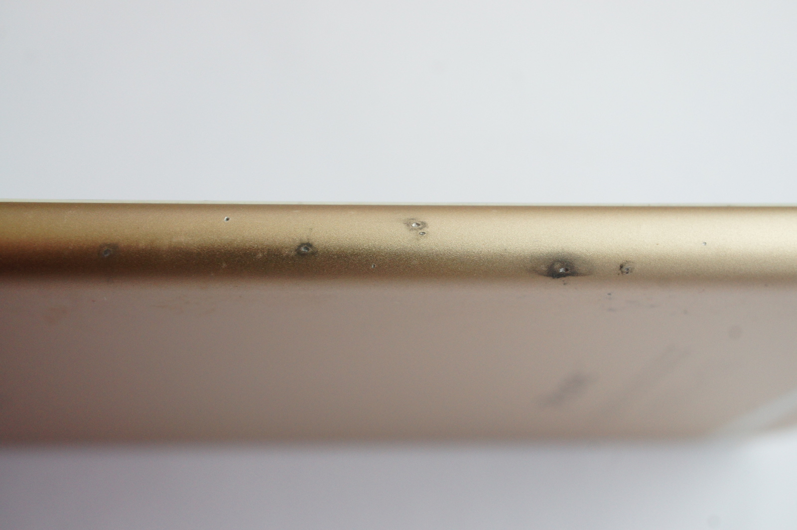 A gold iPhone 6 in the household (approximately 6 months old) is exhibiting corrosion on both sides of the body leading to pits / holes.