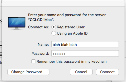 It sounds as if you are trying to connect to your iMac for file sharing over your local network and attempting to log in using the user account name and password for that iMac but it is not allowing you to connect. Is that right?