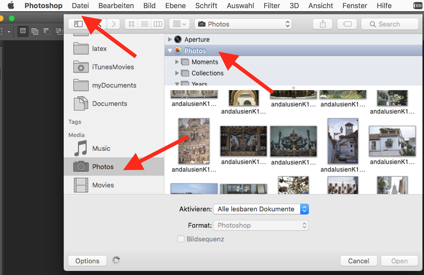 How do I open an image from "Photos" in photoshop? I cannot seem to find my way around the finder to the "Photos" app.