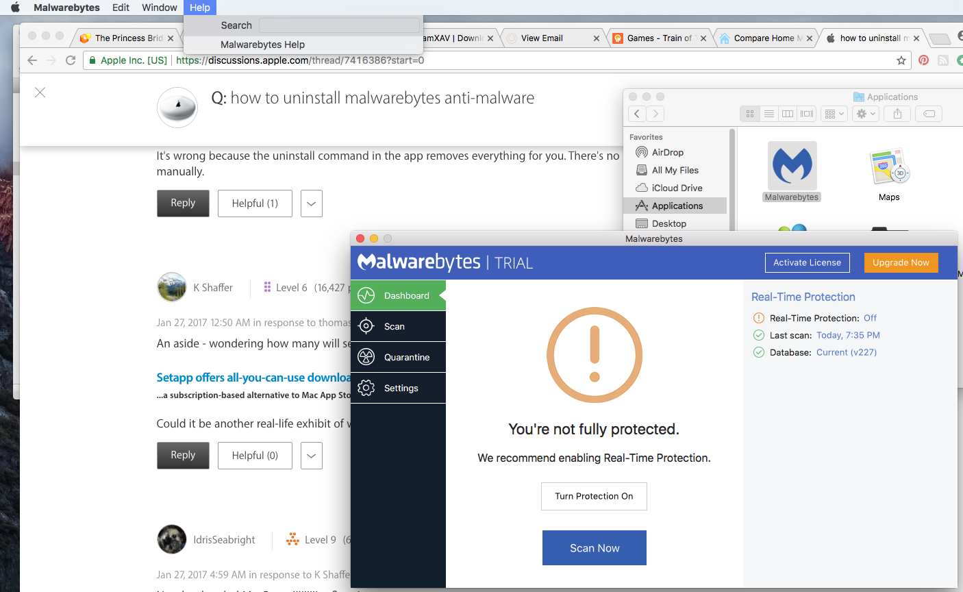 There was no Uninstall option from the Help menu. It didn't look like the screenshot. I downloaded an uninstall package from malwarebytes.com and that didn't work either. The instructions said to drag an icon for the software into a trash icon but you couldn't drag it! Got the circle/slash forbidden symbol.