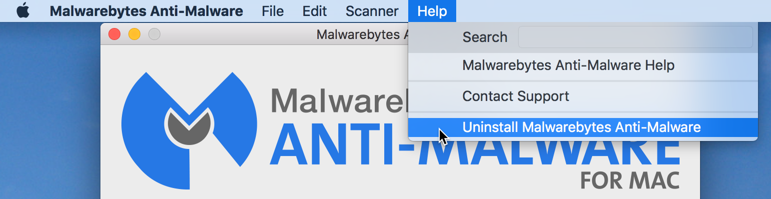 If you have Malwarebytes Anti-Malware for Mac 1.1 through 1.3.1, open the Malwarebytes Anti-Malware application and choose the Uninstall option in the Help menu.