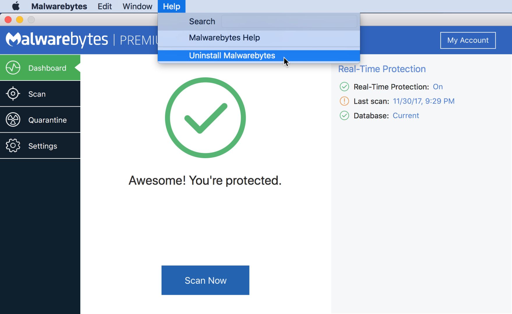If you have Malwarebytes for Mac 3.1 or later, open the Malwarebytes application and choose the Uninstall option in the Help menu.