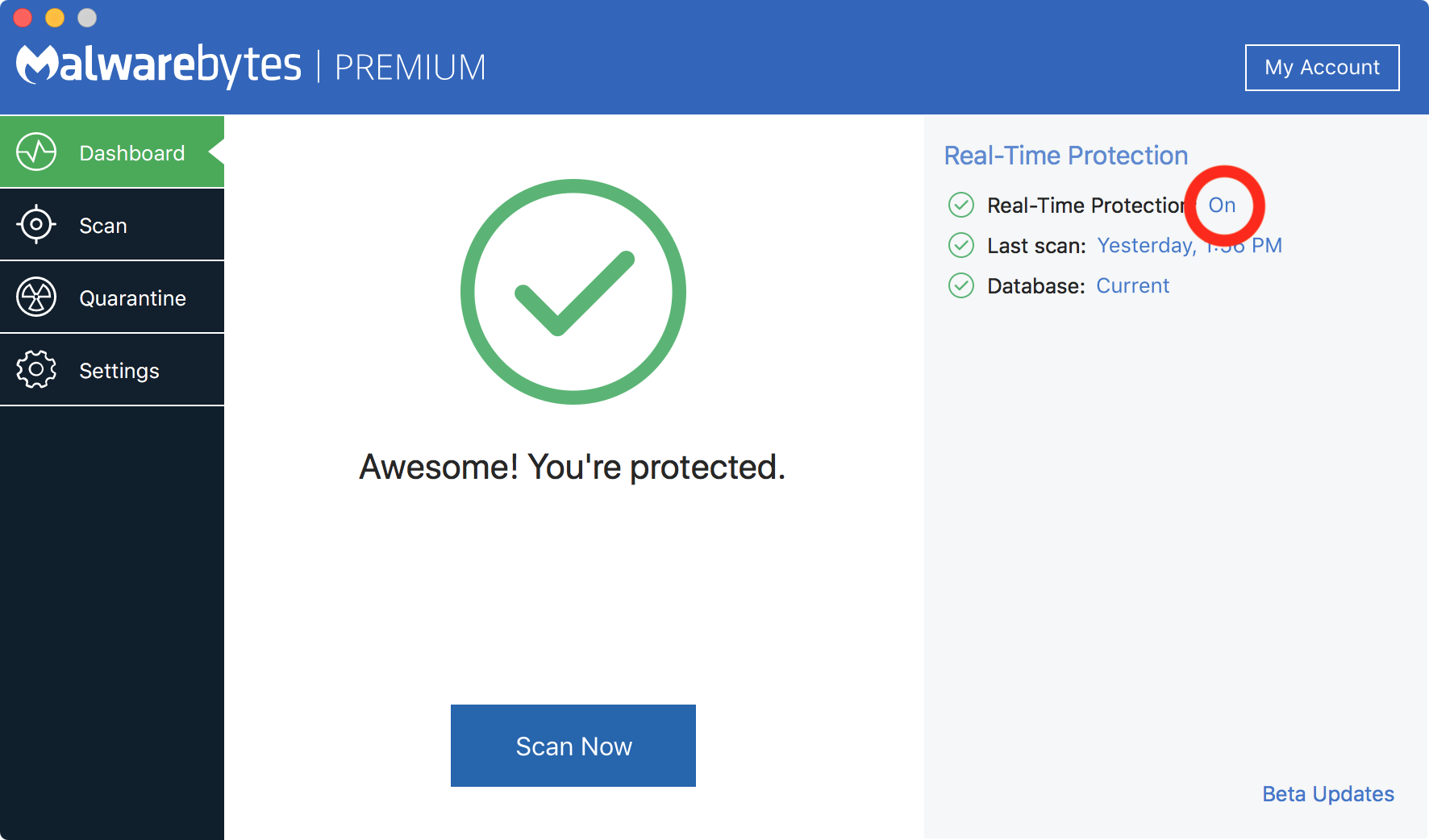 Or click the "On" text next to Real-Time Protection in the app to toggle it to off: