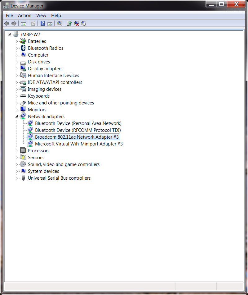 2. My Device Manager configuration after first Sleep test (you have to select the "View->Show hidden devices" menu option!). Now you can see the phantom "Broadcom 802.11ac Network Adapter #2" device instance which is active, but the first one is inactive (failed adapter firmware S3 Resume initialization). In this case I have lost network connection until Reboot/PowerOn. As far as I can see you have one more phantom "Broadcom 802.11ac Network Adapter #3" device instance, so you have the same bug in Apple Airport Adapter firmware.