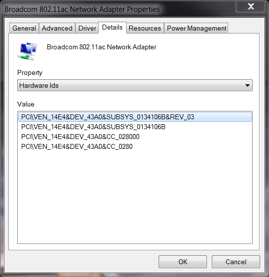 My Air Port card has the hardware id PCI\VEN_14E4&DEV_43A0&SUBSYS_0134106B&REV_03