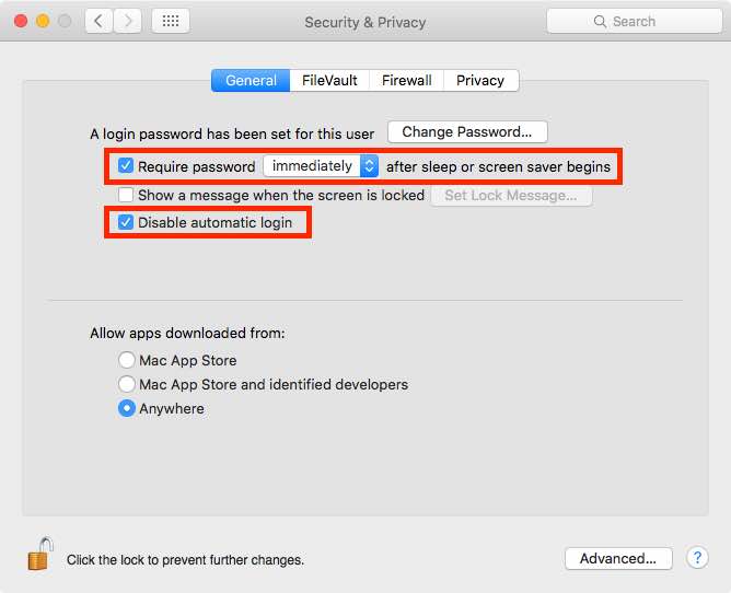 Make sure you've set a password for your user account. Then go to System Preferences -> Security & Privacy and set the following options: