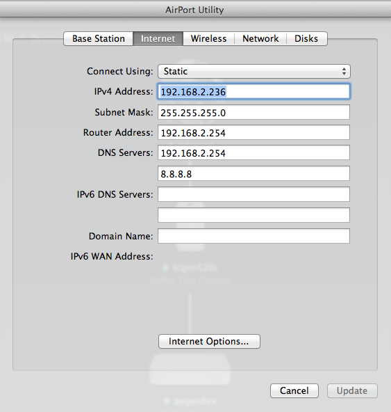 the IPv6 is set to configure 'automatically' i will change to 'link-local'. Note, my desktop version of airport utility looks different then your screen shot on this point. i am using version 6.3.6.