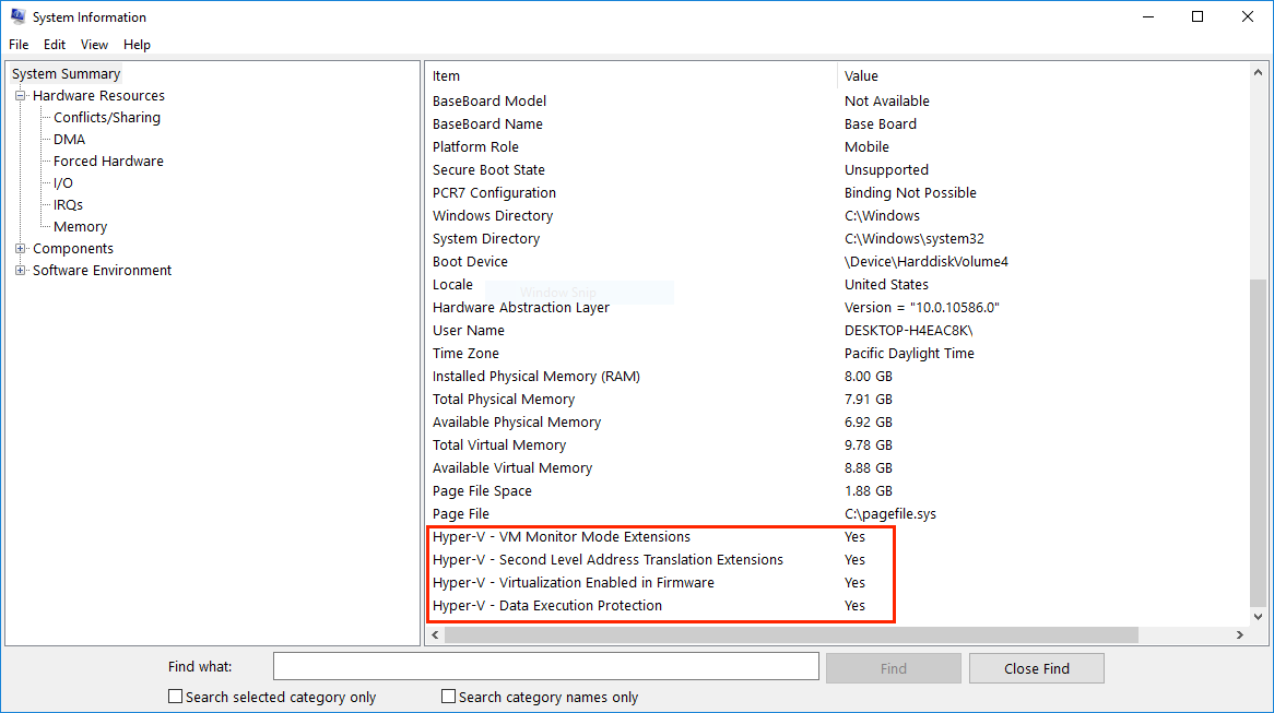 I found them (haven't tried to enable Hyper-V, even though all columns are "yes" as well). What were you wanting me to do with those settings? 🙂
