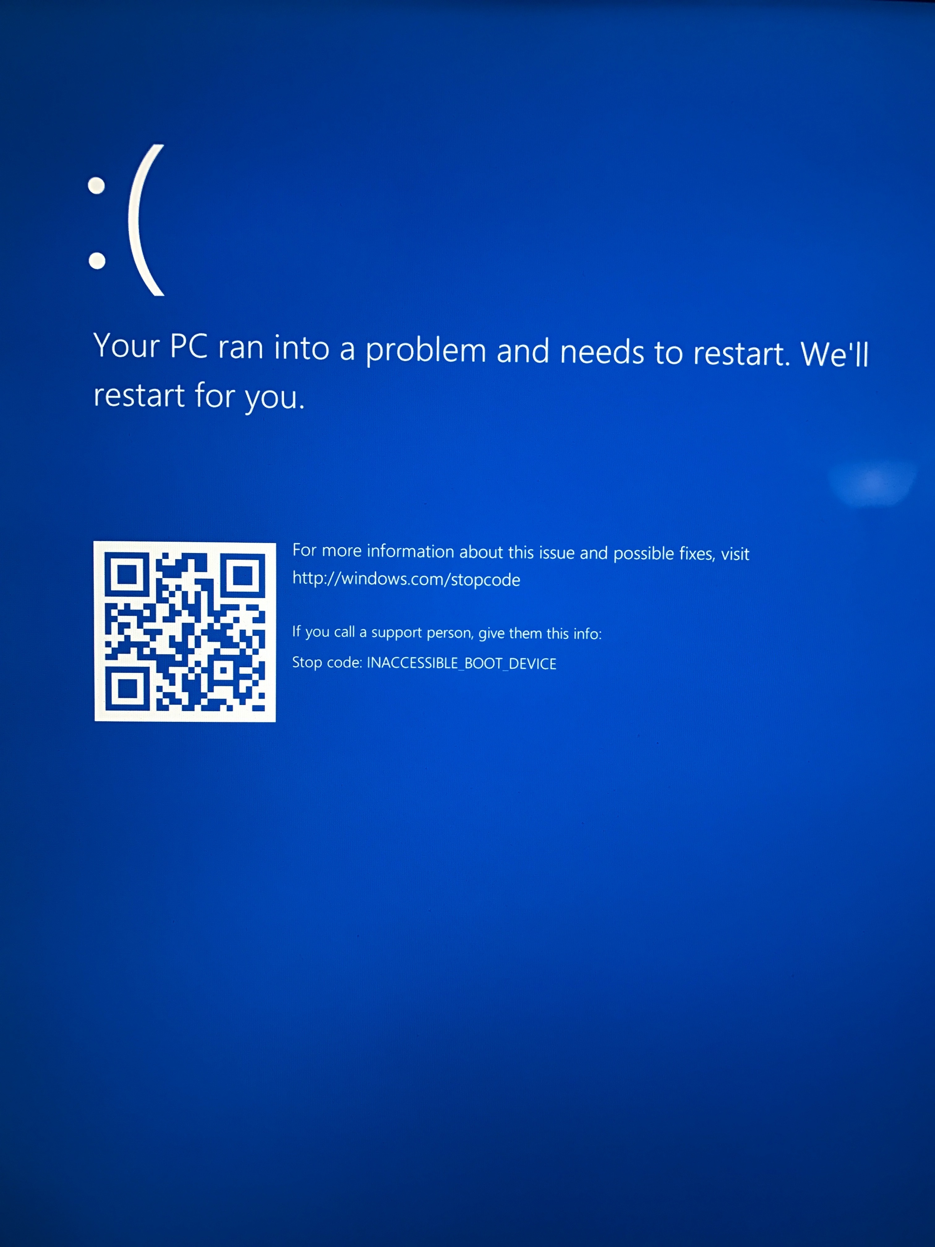 However, when I turn on Hyper-V support (Control Panel > Programs and Features > Add or Remove Windows Features > Hyper-V) I cannot boot into Windows again. Everytime I try it I get a blue screen telling me about an INACCESSIBLE_BOOT_DEVICE.