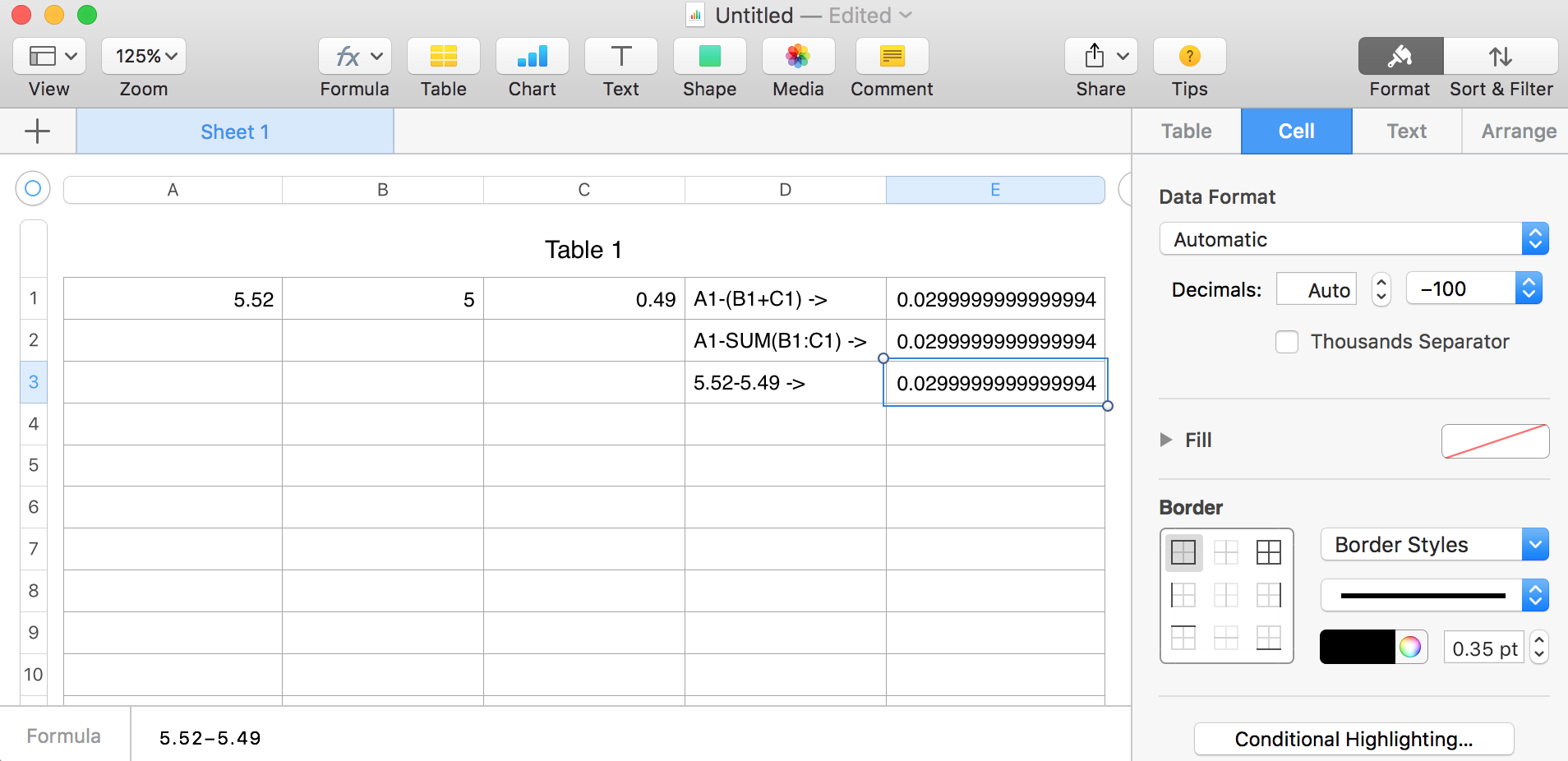 With one exception, the cells of columns C and D in the Numbers table are left at the default "Automatic" formatting, with Numbers determining the number of places following the decimal. The exception is in the selected cell, where I've changed the cell format to "Number." As can be seen, the result in this cell is the same as that obtained by OpenOffice—both applications displayed rounded results in this column until the point where there were fewer decimal values than they were set for, then started displaying it differently—OO as the actual conversion result, Numbers as the same number as before, but now in scientific notation, and with its end obscured by the cell overflow marker on the right.