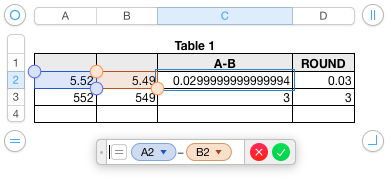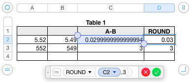 C1: Column C was made wider to accommodate more digits. The "+" places button in the toolbar was used to increase the number of decimal places until the first 0 appeared, then the "X" places was clicked once.