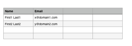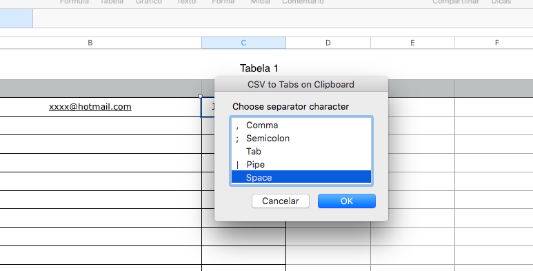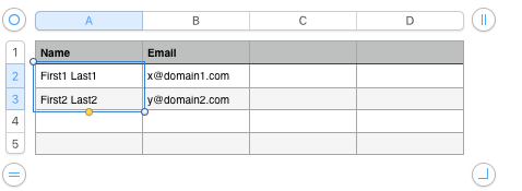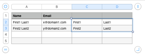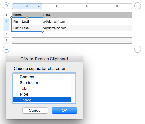 My data, that i copy and paste from pages - first name and last name(in the same cell) | email - 2 cells
