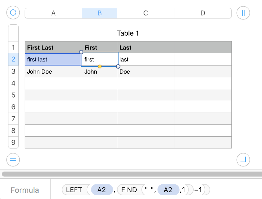 Then select the cells that contain the first and last names together (A2:A3 in my example, C2 in your example) and click the triangle 'run' button in Script Editor. Then click once in a destination cell (in my example C2) and type command-v or choose Edit > Paste and Match Style to paste the split text into separate columns.