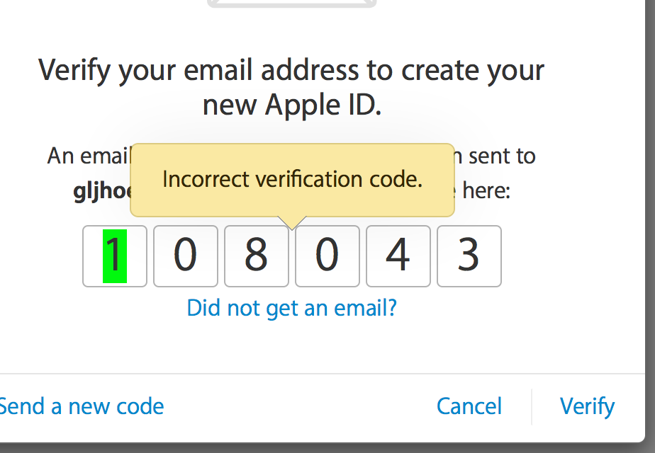 I'm trying to create an AppleID for my son, and when I try, I get all the way to the step of verifying the email address, and after retrieving the verification code from the associated email, I type it into the verification code screen and it does not go on to the next step. I know the code I type in is correct, because if I purposely mistype it, it gives me a "incorrect verificiation code" error (see screenshot). But when I type in the correct code, the little arrow spins after clicking "Verify" and then nothing happens. Does not matter whether I use Safari, Firefox or Chrome. Also have just created AppleIDs for my wife and other son (trying to set up Family Sharing), half hour earlier, on same machine, same browser, same syntax for AppleID, password, etc, etc.
