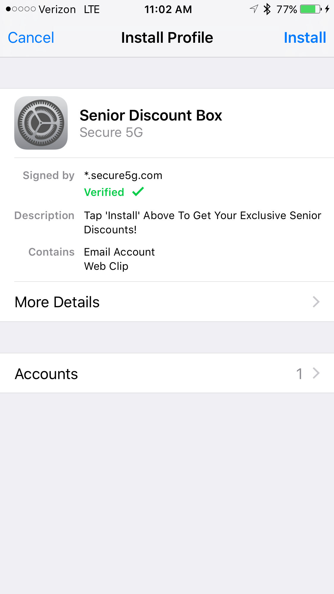My friend's 6S, IOS 9.2.1, had a new mail account "Senior Discount Box" just show up on it yesterday. I was able to uncheck Mail and Notes and change the password and disable the server, but I cannot delete it. Have done a full shut down, but it is still there. Does not show up on her iPad, nor her iMac.