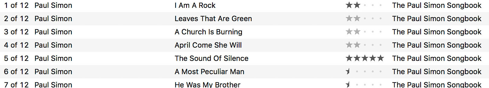 A rather odd thing has happened. Some of my tracks have greyed-out star ratings, see the graphic below. Tracks 1 and 5 are star ratings that I set. But I did not set the greyed out 2-star ratings to tracks 2 3 & 4. I can't remove the greyed ratings: all I can do is reset them to a half-star rating (I have an app to do that). On those tracks to which I have applied a half-rating, I can remove it in the same way one can remove any level of rating; but if I do that on a greyed rating, it simply resets itself to two greyed-out stars.