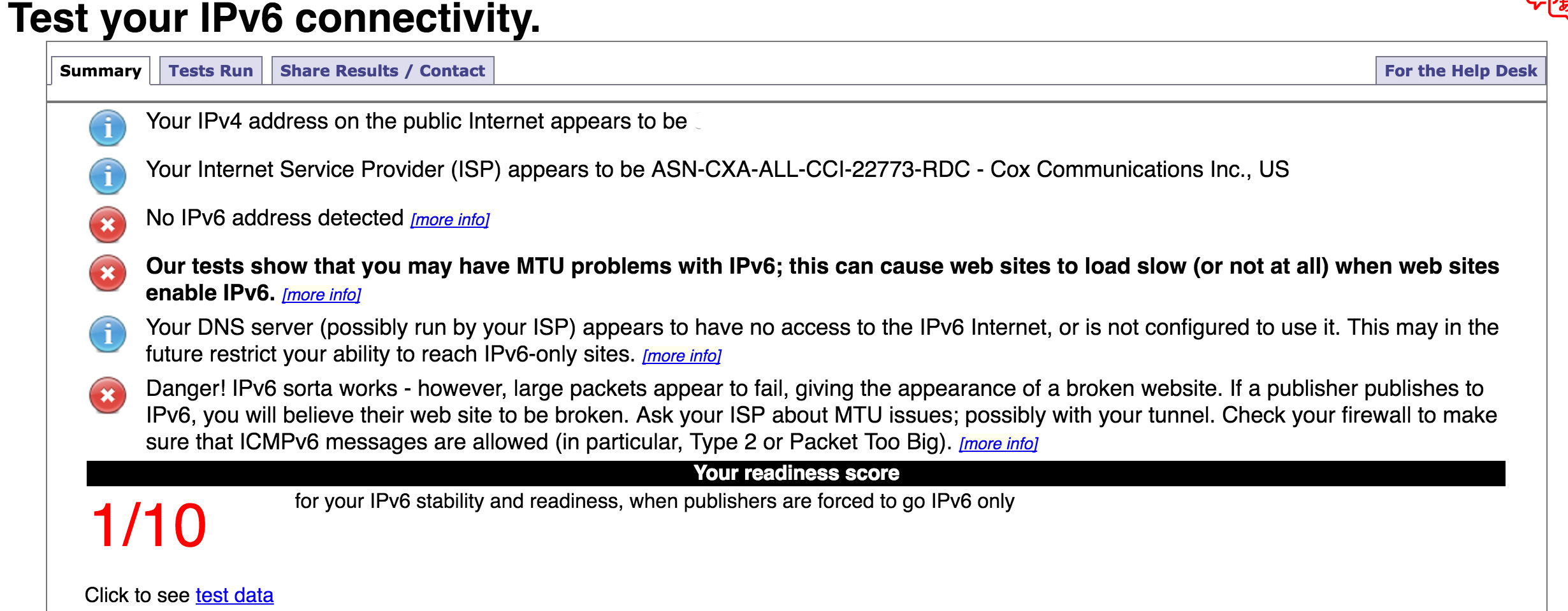 Since then all has seemed well, except I started noticing some wonkiness again this week. Better now, but when I do the two tests I now receive 9/10 ("appears your ISP has no access to the 1pv6 internet") on one and 17/20 on the other.