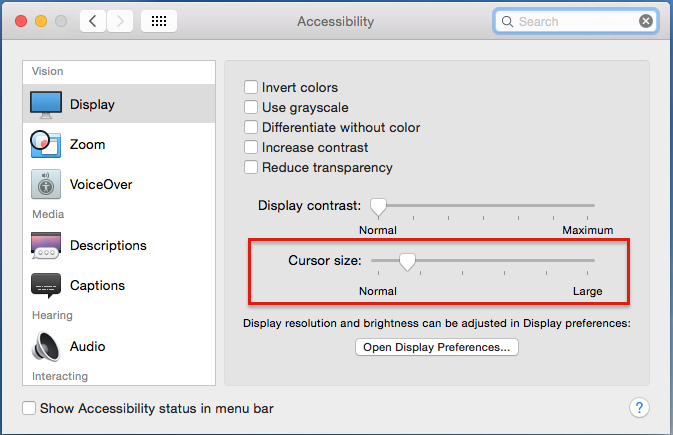 While moving the mouse between displays, I find it difficult to locate the mouse cursor. Is there a preferences setting that will allow me to change the color of the mouse cursor from its default black fill and white outline? Do I need to find a 3rd party application to do this?