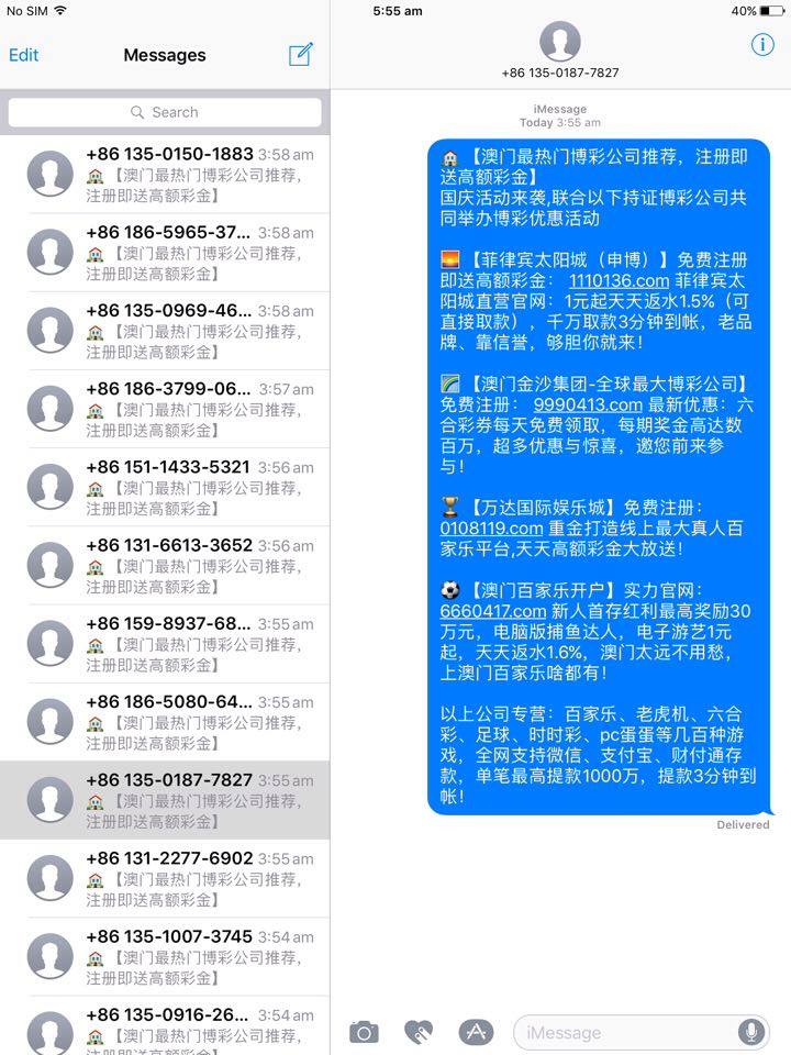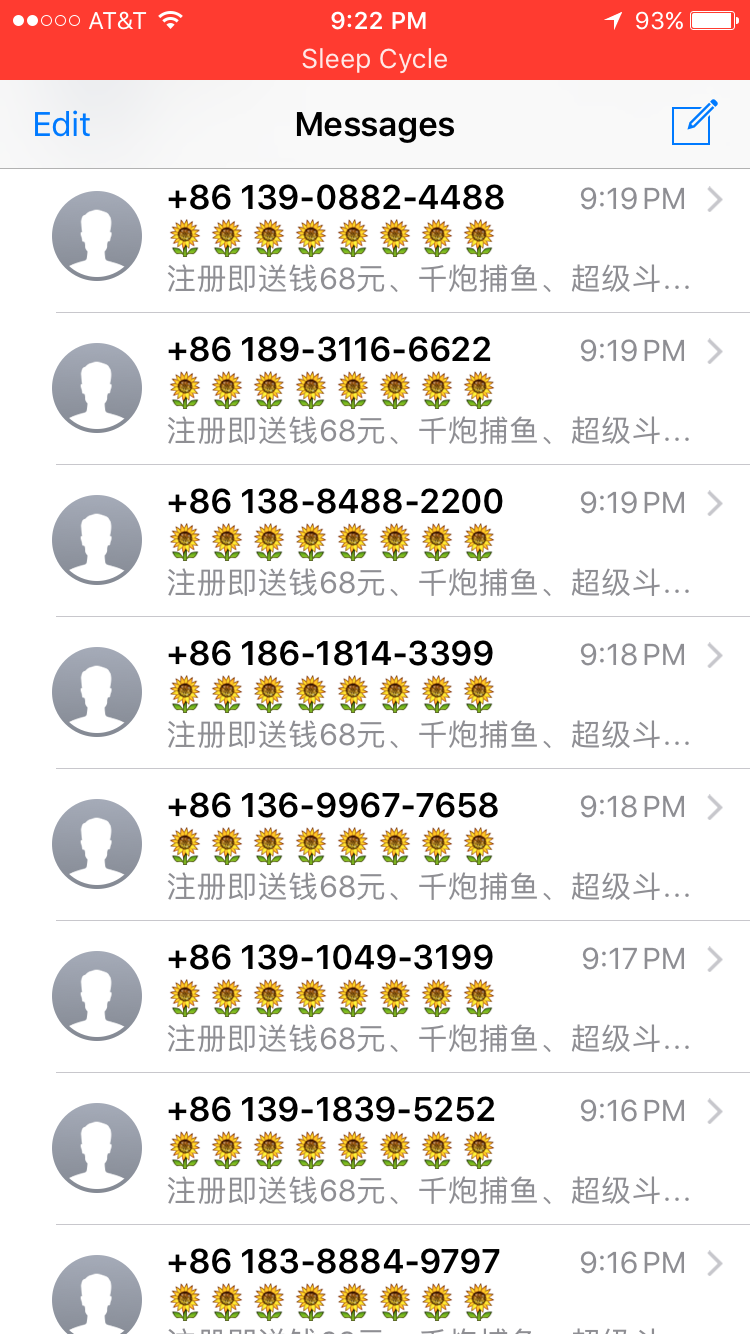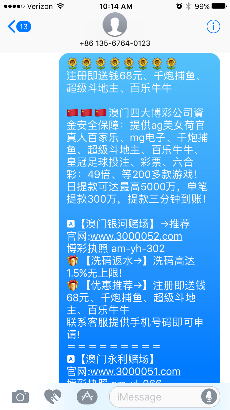I immediately changed my password, but exactly 24 hours later, there were 37 messages sent from my phone to Chinese numbers. The very first one was only 3 number 1s sent separately (as a test?) to the following number: +63 949 577 1323. The other 36 were all to different numbers and included emoticons and url links.
