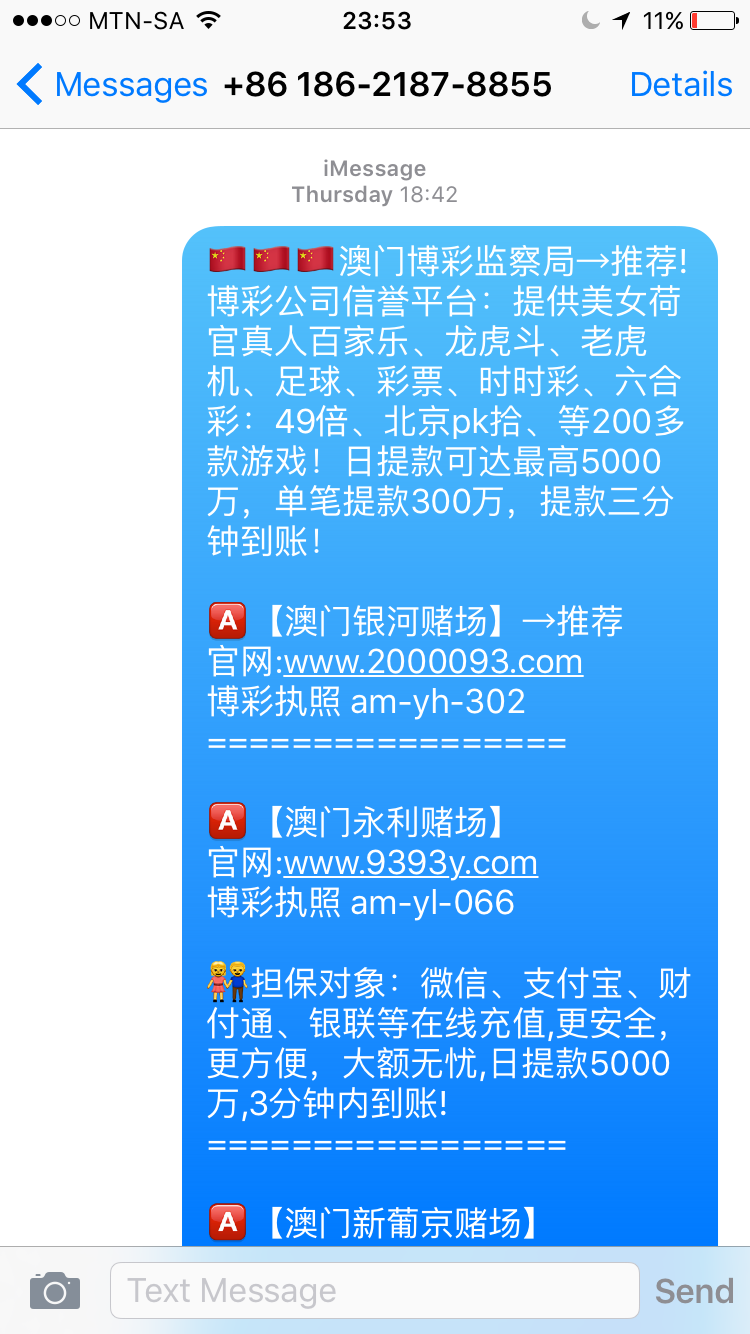 This happened to me as well this morning... Received a notification my iMessage account had been accessed using my Apple ID and Phone Number from a Macbook Air 7,2. About 30 or so of the Chinese message came though as having been sent from my phone. Logged out of Messages on my laptop and changed my Apple ID password. It stopped after that. Hopefully nothing else is compromised.