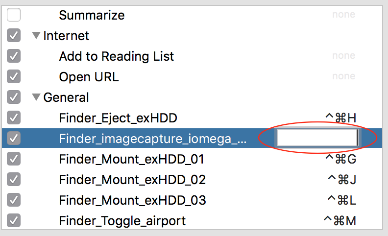 So I'm trying to enter a key command in the "Services" section of the Keyboard Shortcuts. It just won't let me enter any text at all. I've looked through old posts and people have said that you just select the shortcut without clicking in the box and enter your desired keys but that is not working for me. I've tried this on several computers with no luck. There has to be something small that I'm missing. If someone has this working in El Capitan can you clarify this for me?