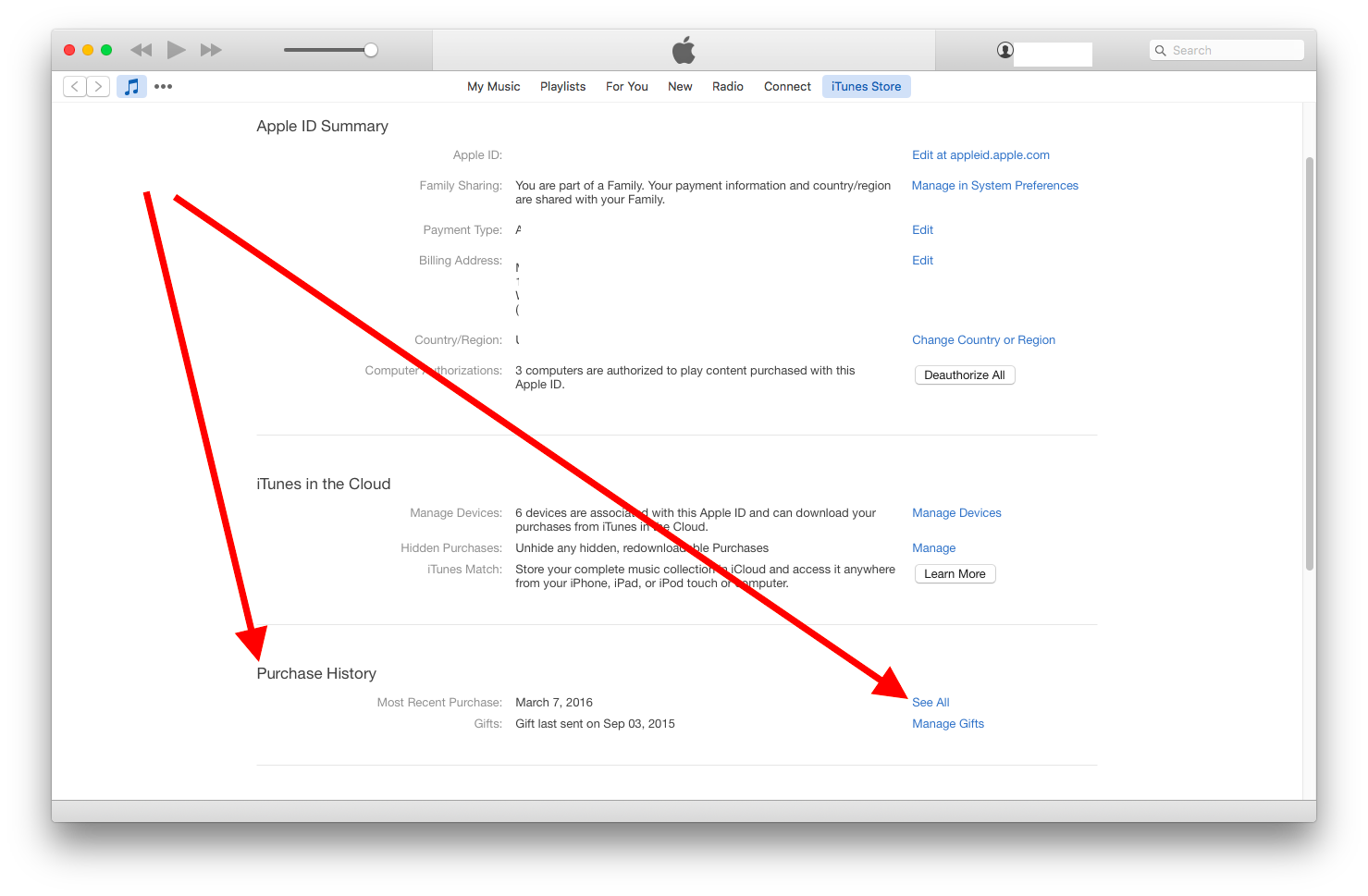 First, you want to take a look at your Account record to ensure that you did not make this charge (sometimes the receipts can come days later). Open iTunes on your computer and sign in, then under your name, click on Account Info. Once in the Info screen, click on "See All" under Purchase History:
