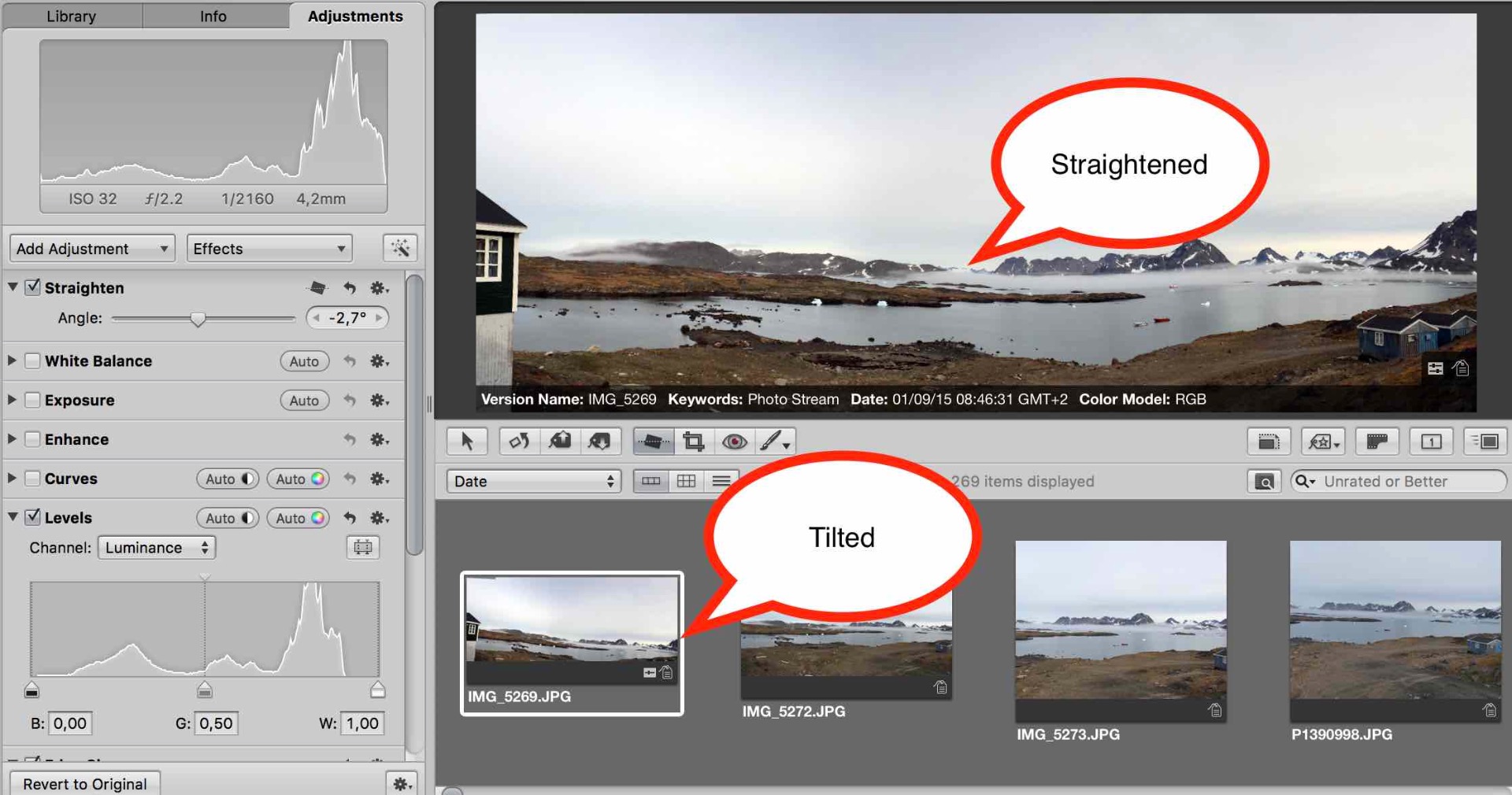 When straightening them I tilted the horizon to the left. As soon as I added the Curves adjustment, the horizon in the thumbnail tilted to the right.