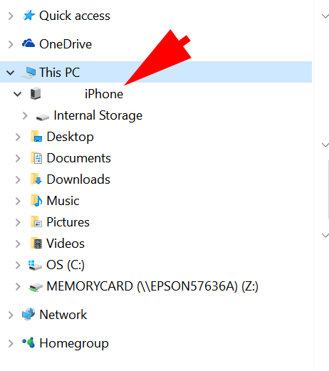 Connect your iPhone to the computer, open File Explorer and expand the folder structure on the left. Do you see the phone as shown below? Note that sometimes F.E. does not recognise the phone immediately. If it does not, unplug the phone and plug again, wait a couple of minutes or so. If still no go, disconnect, reboot PC again, connect and check. Try connecting at least 3 times. Give it 5 minutes or more before you give up.