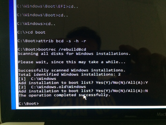 Or do I have to try and issue the bootrec /buildBCD from command within windows and choose N en Y when he askes for the boot options ?