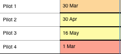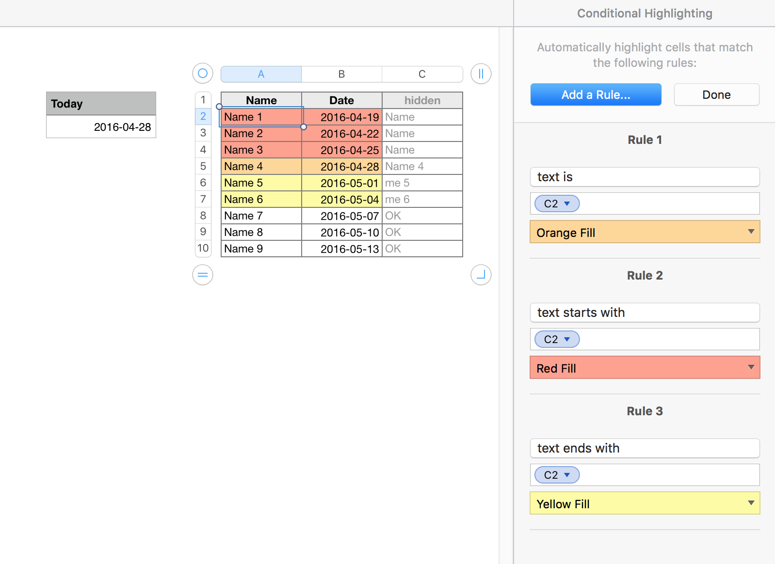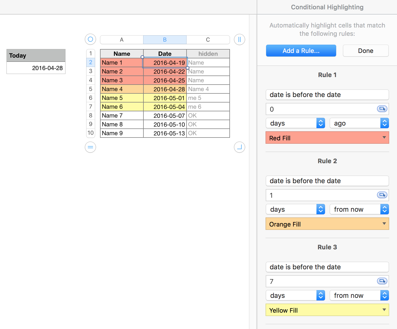 Three conditional highlighting rules can be accommodated with a single auxiliary column, as shown below. (The small table, showing today, is included only to show the current date when the screen shot was taken, and is not used in the solution.